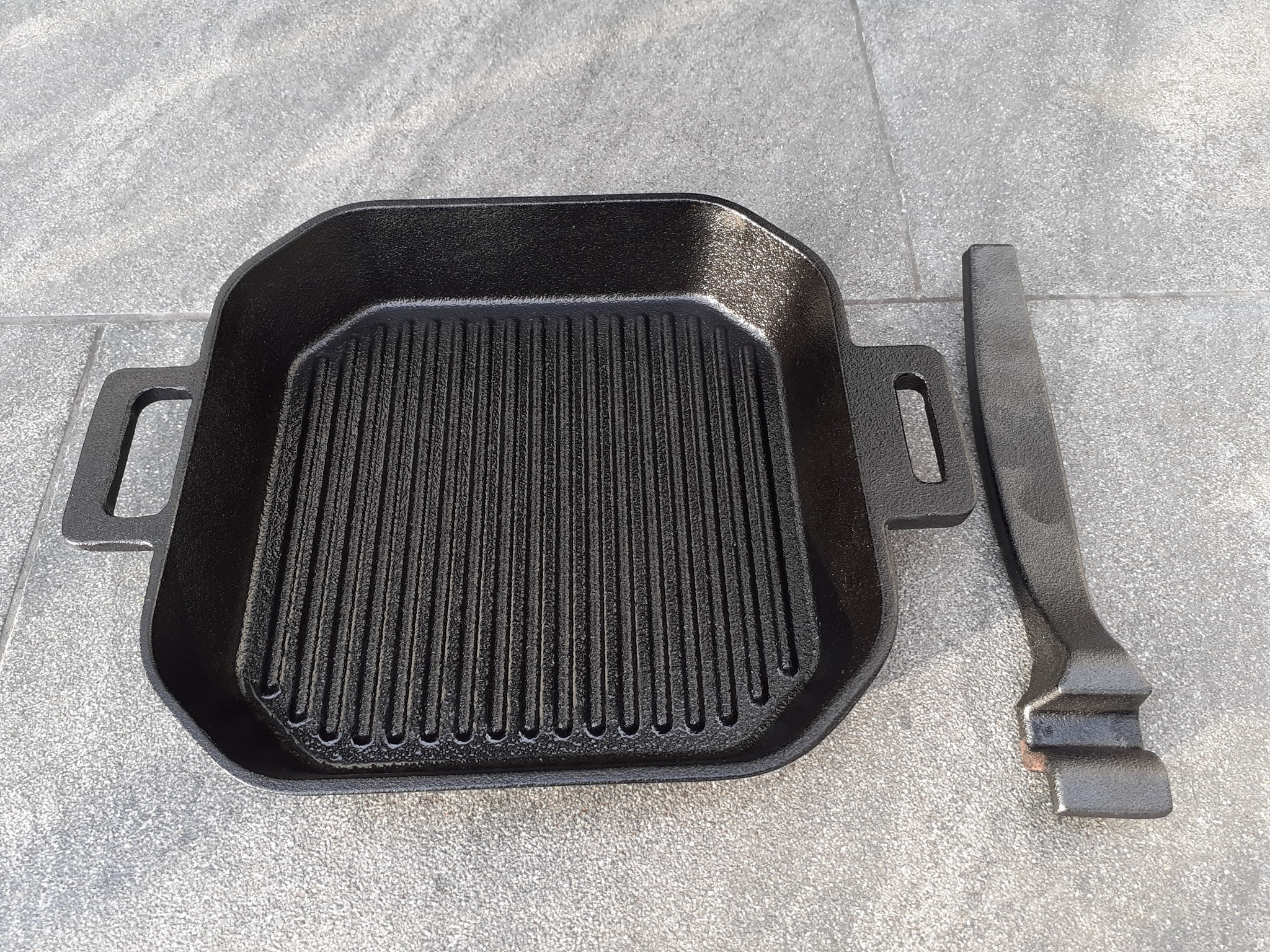 NEU 2022: Gusseisenpfanne der Firma Santos eckig 20 cm. Reicht für ein Steak das man sich dann eben teilt, bevor man das nächste macht. Die Steaks aus einer Gusspfanne sind ein Genuss.