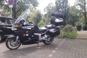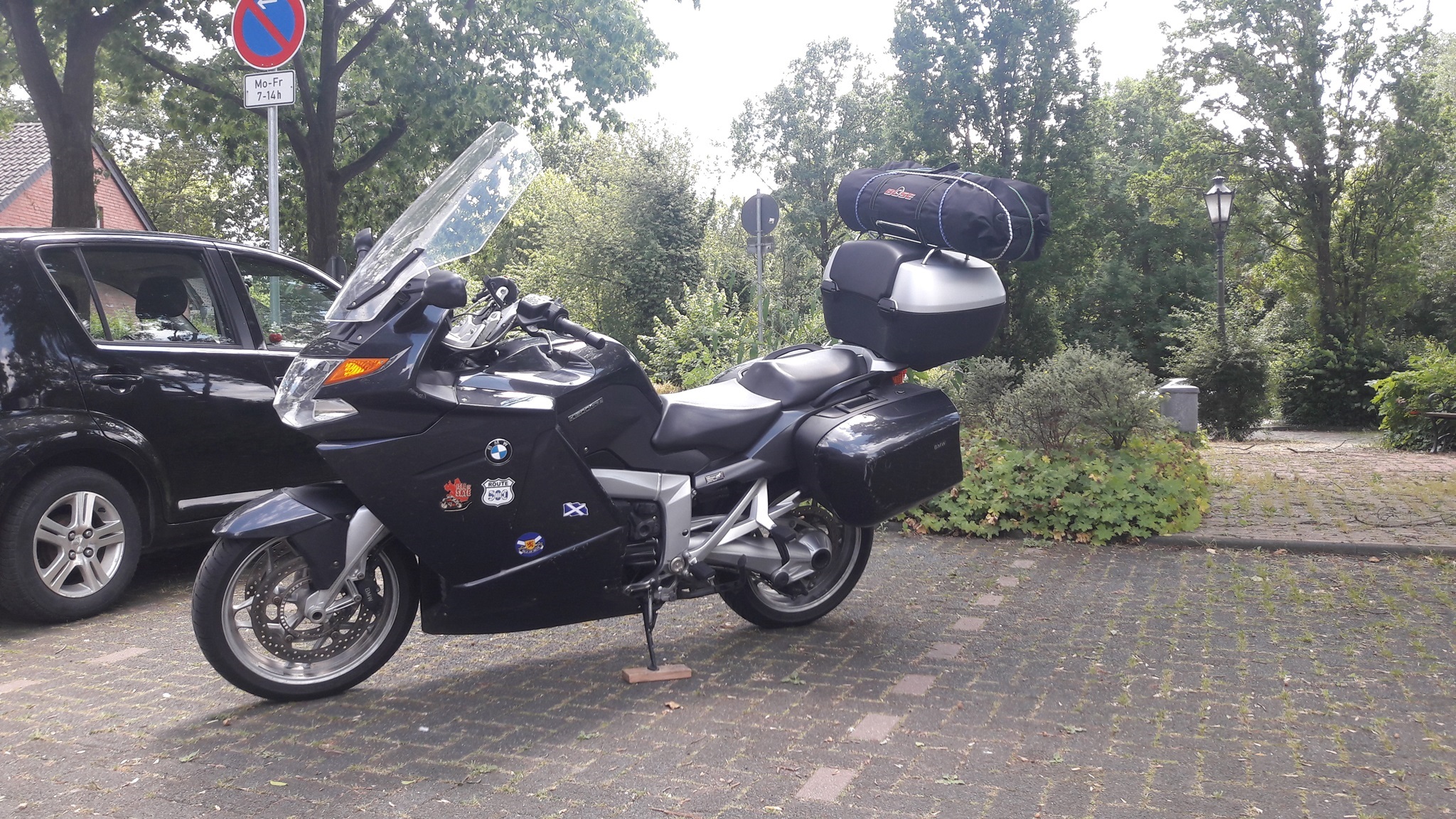Die K 1200 mit 2 Personen und Koffern mit der Rolle auf dem Top Case ist extrem Windanfällig.