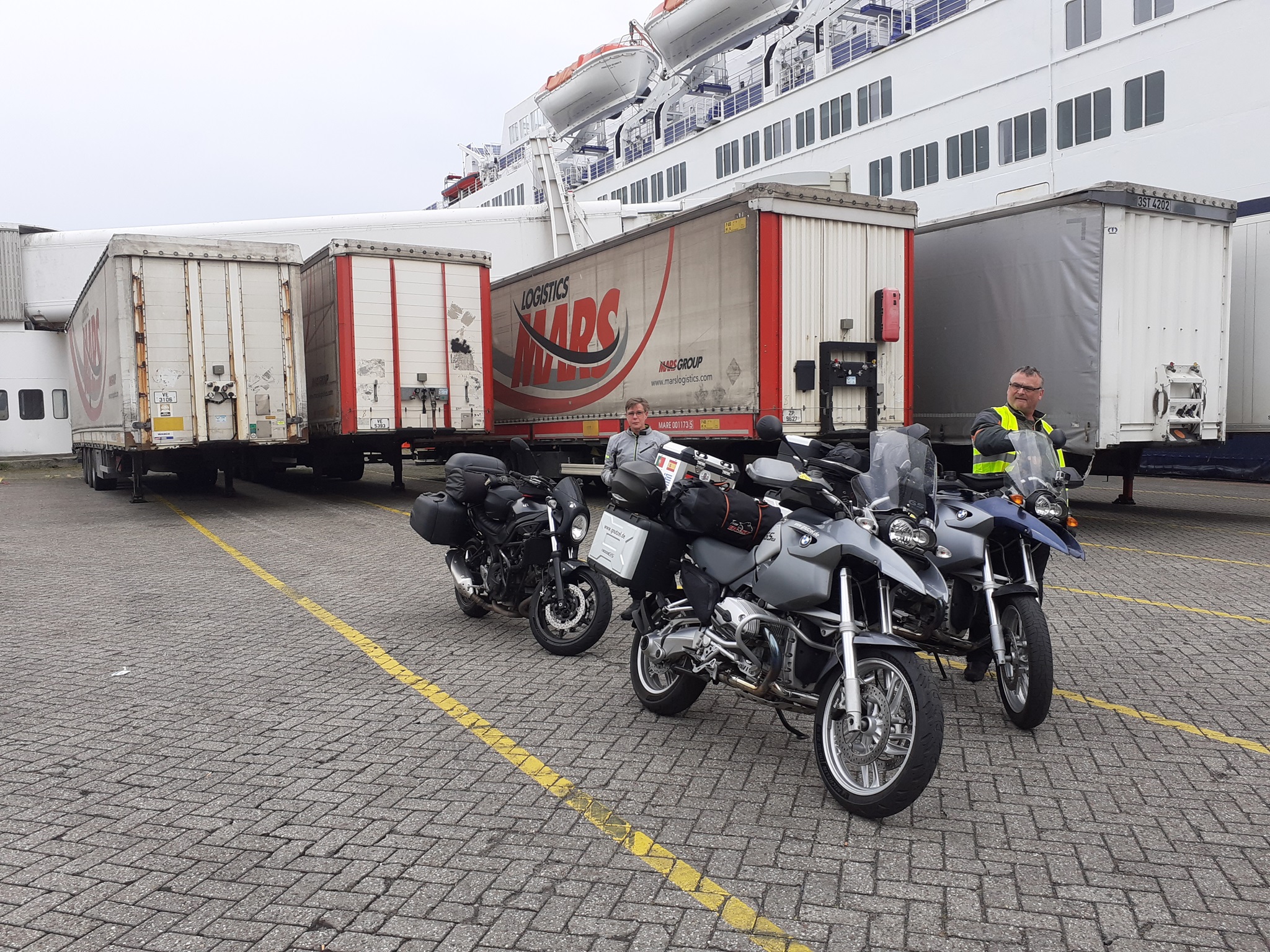 von der Tanke gab es nichts Spannendes. Das Einschiffen und die Zollformalitäten gingen wie immer ganz schnell. In der Schlange der Motorradfahrer wurde es schon spannender. Ich liebe es in der Reihe zu stehen und Benzingespräche zu führen oder Erfahrungen auszutauschen. Man kann noch so viel mitnehmen von den Erfahrungen der Mitreisenden. Da ich mir die GS erst vor kurzem zugelegt habe, waren die Informationen der langzeit GS Besitzer höchst informativ. In der Schlange waren schon ein paar interessante Leute anzutreffen. Da gab es das Paar mit den nagelneuen Kutten und vielen Landesflaggen inklusiver der Schottischen.
