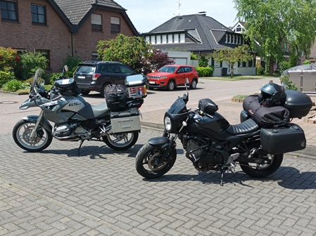 Während ich noch mit meiner Gisela beschäftigt war, hatte Melanie Ihr Mopped schon in Gänze verzurrt. Dann war ich richtig Stolz auf Melanie, sie hat den weitgereisten Kuttenträgern