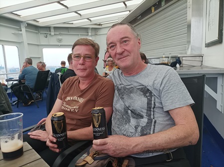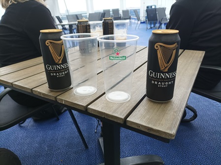 Danach ging es wie immer zur SKY BAR, erst mal ein Guiness. Die Motorradfahrer finden sich immer wieder zu Benzingesprächen zusammen. Der Erfahrungsaustausch ist immer wieder lehrreich auf beiden Seiten. Das Vater Sohn Gespann mit dem Mottoshirt "begleitendes Fahren", genauso wie die Truppe mit dem Mottoshirt "Whiskytrail 2022" hat sich in der Skybar vergnügt. Dort gab es dann den Klassiker, die Tuppe einer Versicherung, erst 10 Mann, je später