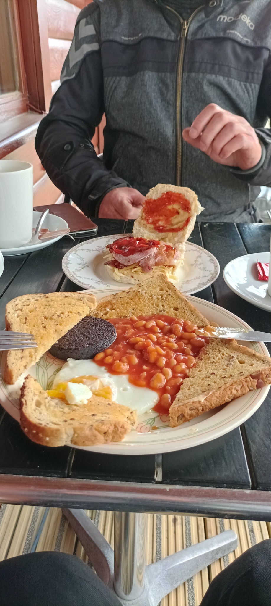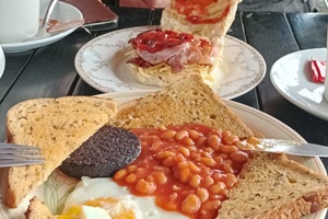Dort gab es ein Full English Breakfast für Melanie und ein Bacon Roll with Cheese für mich.