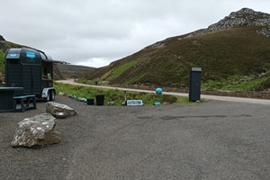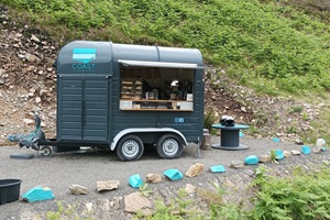 Hier steht der Pferdeanhänger von Karen. Der Cappuchino schmeckt echt toll. Kaffee können die Schotten überhaupt nicht.